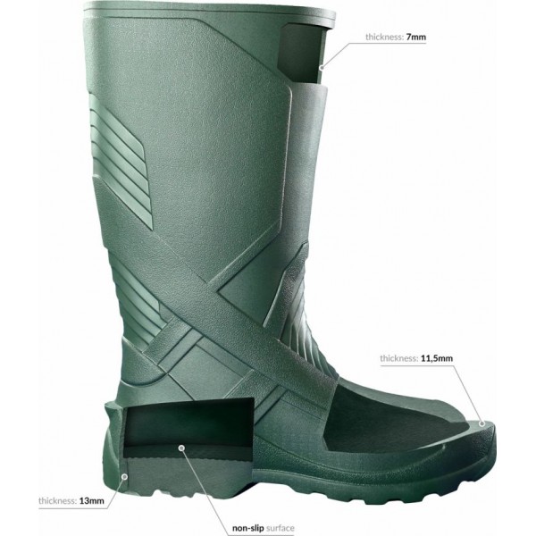 Šilti, lengvi, lankstūs ir tvirti batai su išmaunamu pašiltinimu yra pagaminti iš ypatingai lengvos EVA medžiagos, kuri nepralaidi vandeniui ir šalčiui. Išimamas pašiltinimas patikimai saugo nuo šalčio, greitai džiūsta ir yra lengvai skalbiamas. Sveria dvigubai mažiau nei paprasti guminiai batai. EVA yra sunkiai praduriama medžiaga, lėtai dėvisi. Neskilinėja ir nekeičia savybių iki -30°C šalčio. Batai pasižymi gera šilumos izoliacija. Padas yra tvirtas ir slydimui atsparus.
