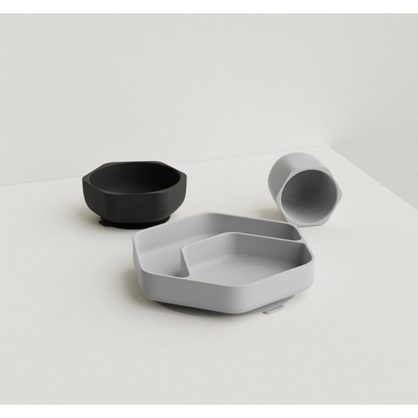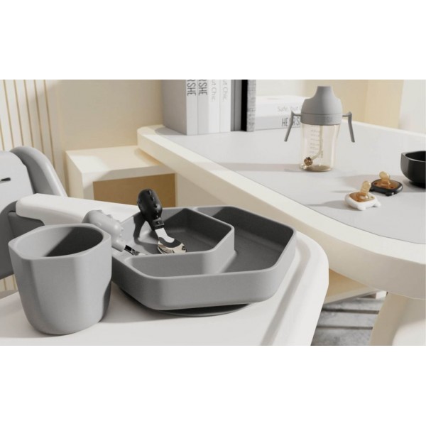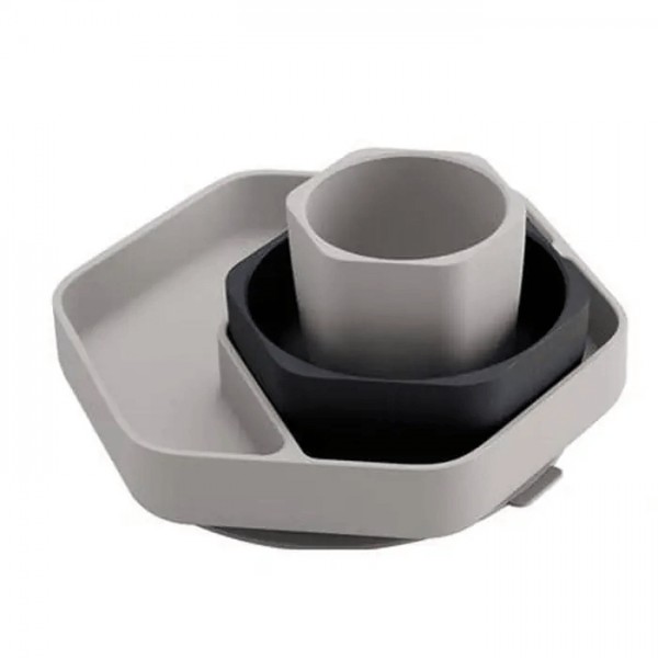 Šis rinkinys sukurtas taip, kad maitinimo procesas būtų patogesnis, saugesnis ir estetiškas. Visi indai pagaminti iš minkšto, lygios tekstūros silikono, kuris yra visiškai saugus vaikams, be BPA, PVC ar ftalatų. Bičių korio tipo lėkštė ir dubenėlis su tvirtu siurbtuku neleidžia indams slysti nuo stalo, o ergonomiškas puodelio dizainas padeda mažyliui lengviau mokytis gerti savarankiškai.