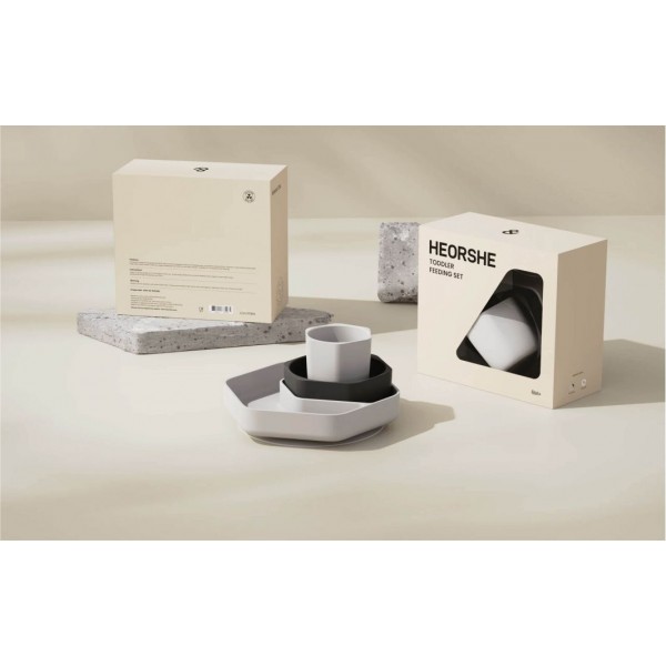 Heorshe silikoninių indų rinkinys – stilingas ir praktiškas pasirinkimas kasdieniam vaikų maitinimui. Rinkinį sudaro bičių korio tipo lėkštė, dubenėlis ir puodelis, pagaminti iš 100 % maistinio silikono. Indai atsparūs šilumai, tinka mikrobangų krosnelėms, indaplovei ir šaldikliui.