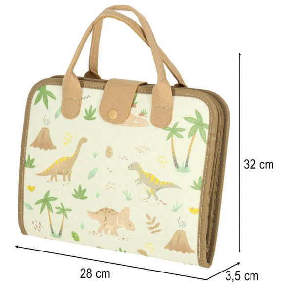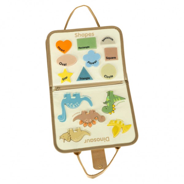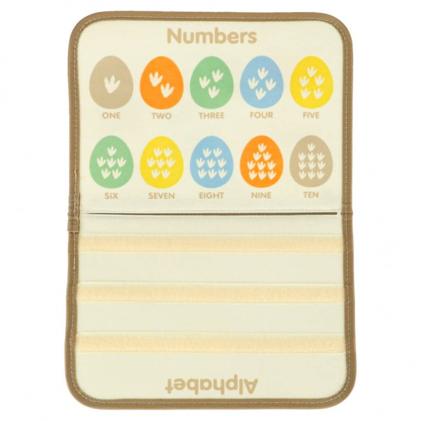 - Rinkinyje yra veltinis, spalvingi dinozaurai ir užrašai anglų kalba (pvz., „dinozauras“, „formos“) – kalbos mokymasis žaidžiant.