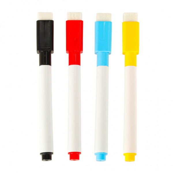 - 4 x sauso trynimo žymekliai su trintuku gale – galite piešti ant lentos ir ištrinti.