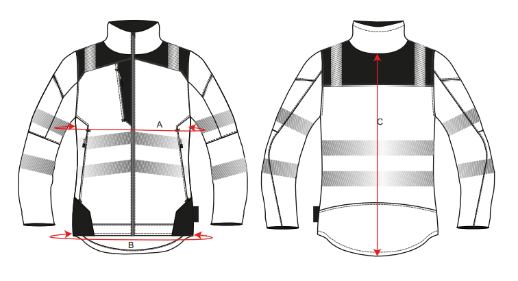| Krūtinė, 2,5 cm žemiau rankovės angos | A | 106 | 110 | 116 | 124 | 132 | 140 | 148 | 156 | 168 | 180 | 1 |