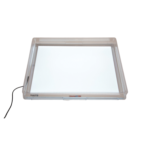 Komplekte taip pat yra skaidrus, iš plastiko pagamintas A3 formato specialus padėklas, skirtas šviesos lentai uždengti. Jis puikiai užsifiksuoja ir nuo šiol galite nebijoti dažyti ar žaisti su smėliu, koncentruojant vaikų dėmesį į sklindančią šviesą! Padėklo dydis: 490 x 370 x 53 mm. Vidinis gylis 44mm.